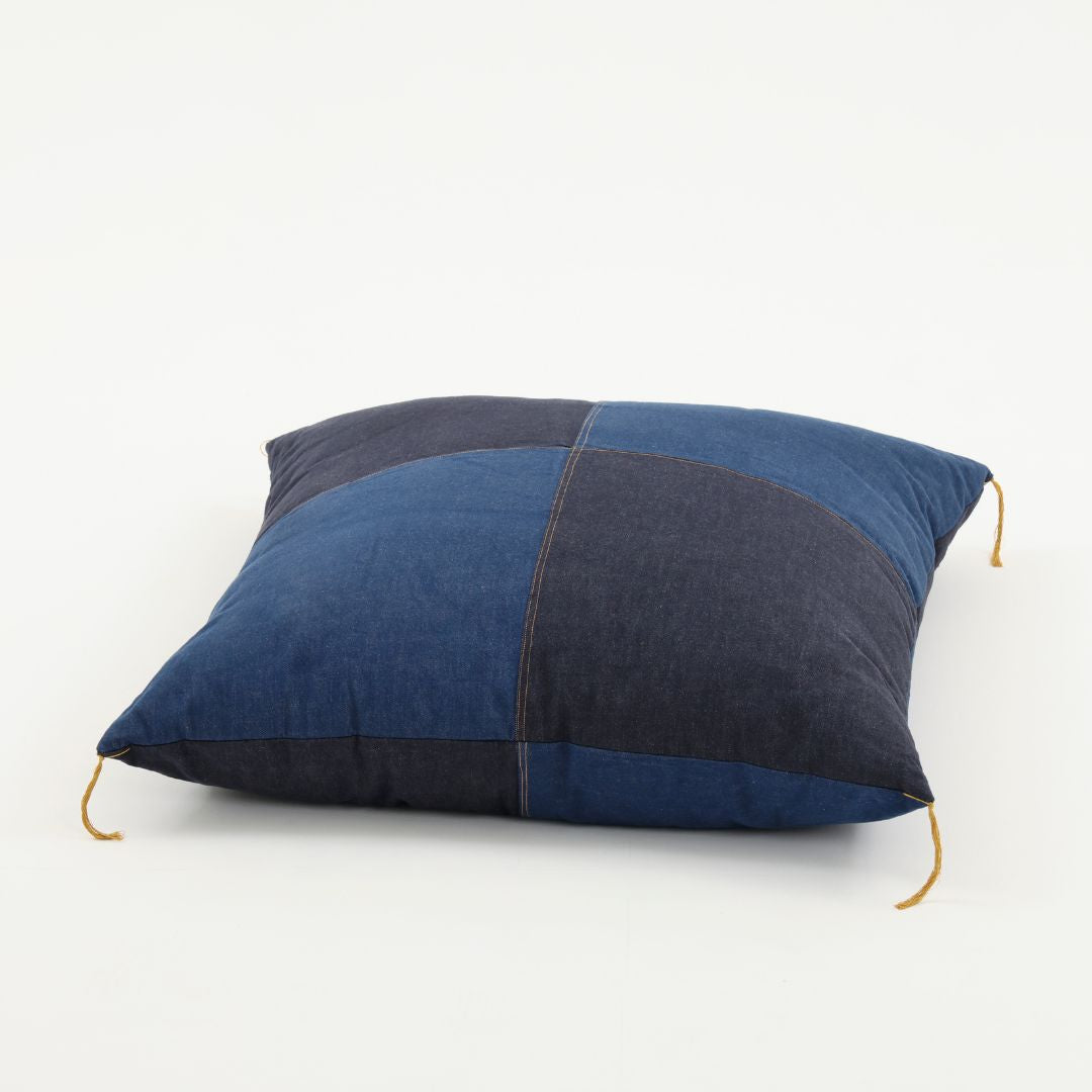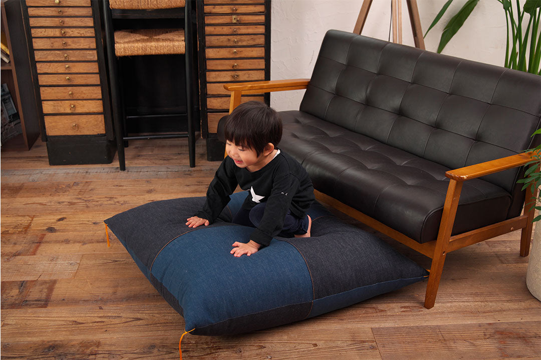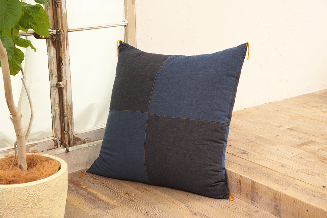 職人が厳選した国産デニムを全面に贅沢に使った、一般的なサイズ(銘仙判)の約1.5倍=90cm角の特大サイズ座布団。使い込むほどに風合いが増し、あなただけのオリジナルな座布団へと育ちます。