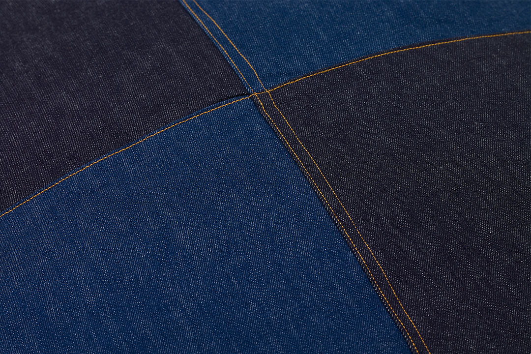 側生地は柔らかな肌ざわり滑らかな2色のデニム生地を市松模様に縫い合わせました。